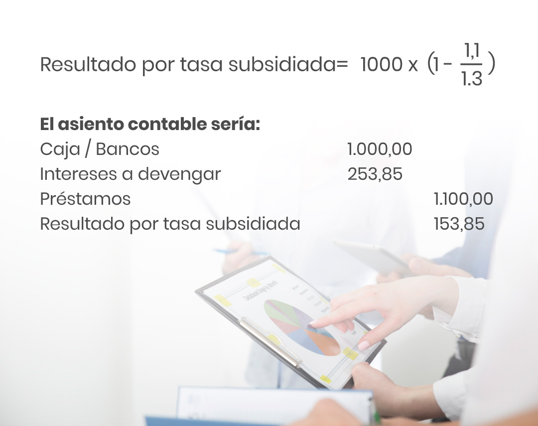 Ejemplo de un resultado originado en un préstamo del gobierno a una tasa de interés inferior a la del mercado: Una entidad recibe un préstamo por 1.000 de pago íntegro a un año con un interés del 10% anual. La tasa de mercado es del 30%.