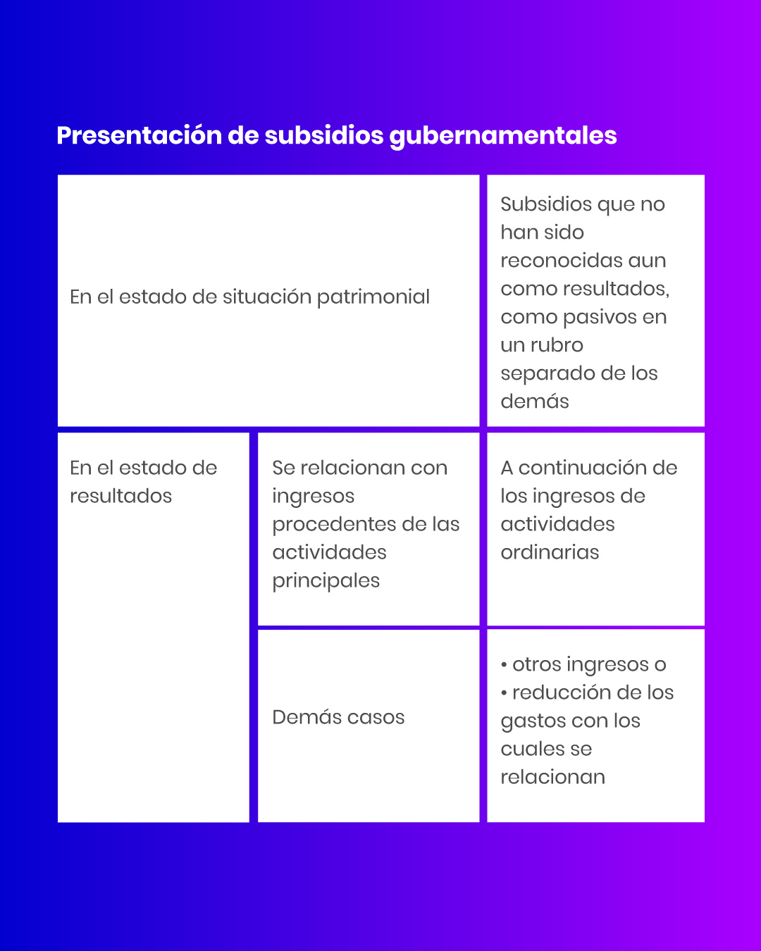 La NUA los trata a partir del párrafo 560. Es un tema novedoso, las normas anteriores – ahora derogadas – no incluían este tema. Durante la pandemia del Covid 19 fue bastante común que las empresas recibieran subsidios gubernamentales, viéndose obligadas en ese entonces a usar solamente el criterio y la analogía.